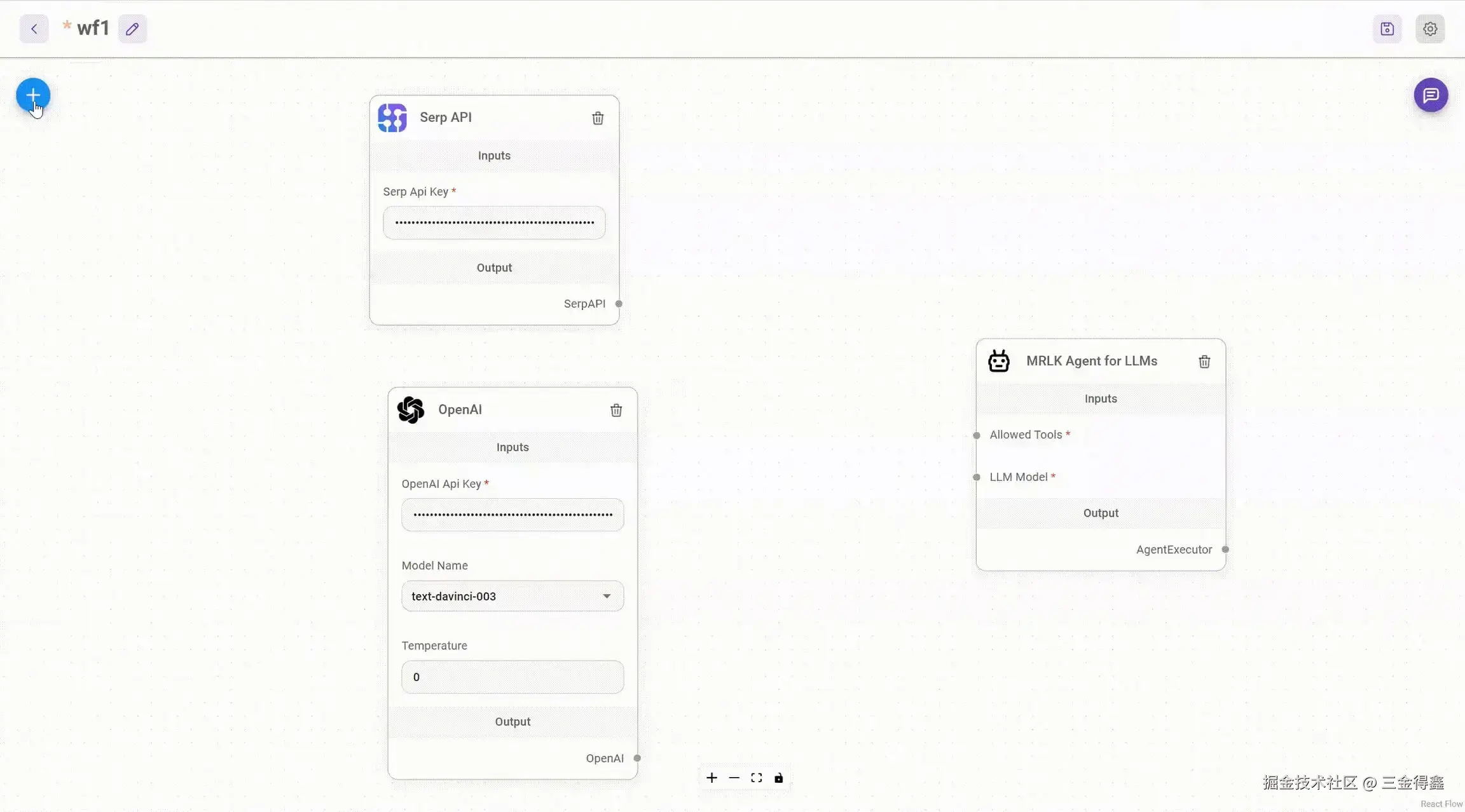 说是低代码,其实更多的时候它也是无代码,我们只需要在一块画布上,先点击左上角的添加按钮新增工具卡片,然后通过拖拉拽的方式将这些工具串起来就可以得到一个 AI 应用。