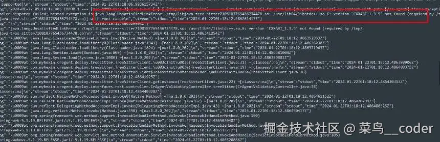 起初没意识到编译库对环境非常敏感时,我就直接在Docker中搭建了CentOS的系统,编译出了一个java-tree-sitter解析库;当部署到运行的服务器环境时,就报了下面这个错误: