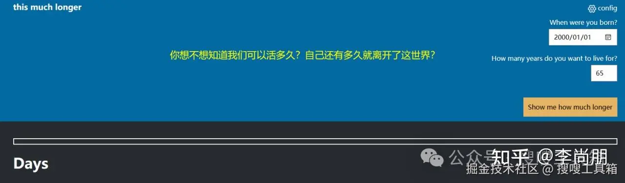 要知道我们每天都在做着各种各样的选择,然后什么是有意义的,什么又是毫无价值,有时候我们根本没机会想。请尽可能输入一个你认为算得上长寿的年龄吧,看看我们时间还剩多久,生命倒计时计算工具分享给大家,希望大家能够喜欢,好好想想接下来的路该怎么走?茶壶儿觉得还是蛮有意思的网站!