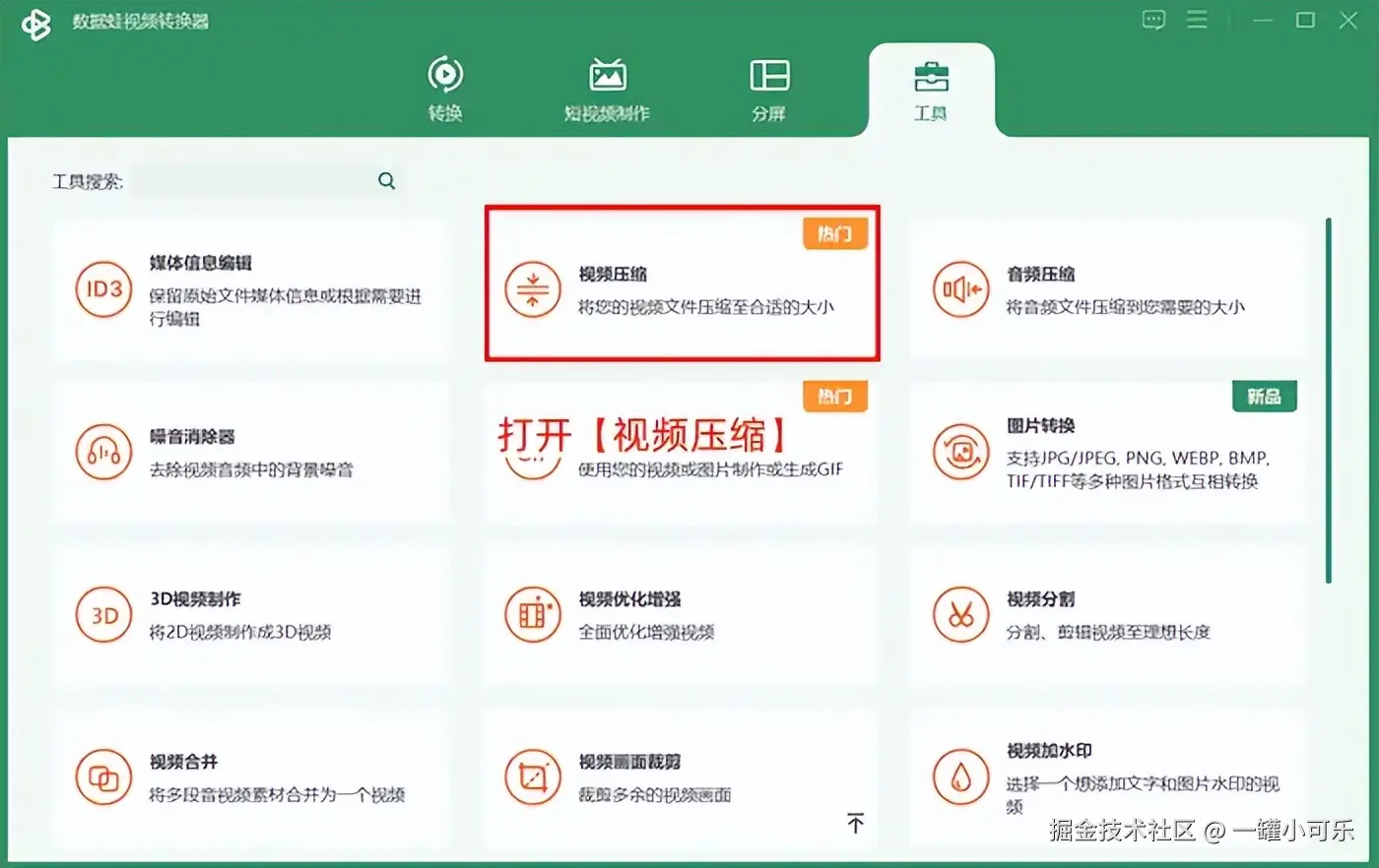 步骤1:打开该视频压缩工具,在工具箱中找到并打开【视频压缩】选项。