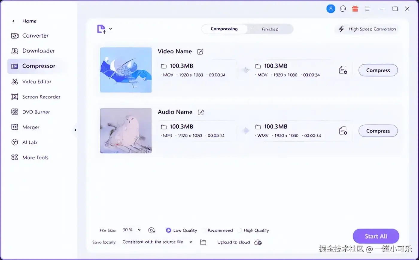 Wondershare UniConverter是一款综合性的视频处理工具,具备压缩视频的功能。使用这个工具不仅可以解决如何将视频文件压缩变小的问题,还可以预设压缩质量以及自定义视频压缩参数,为用户提供了很大的自主性。