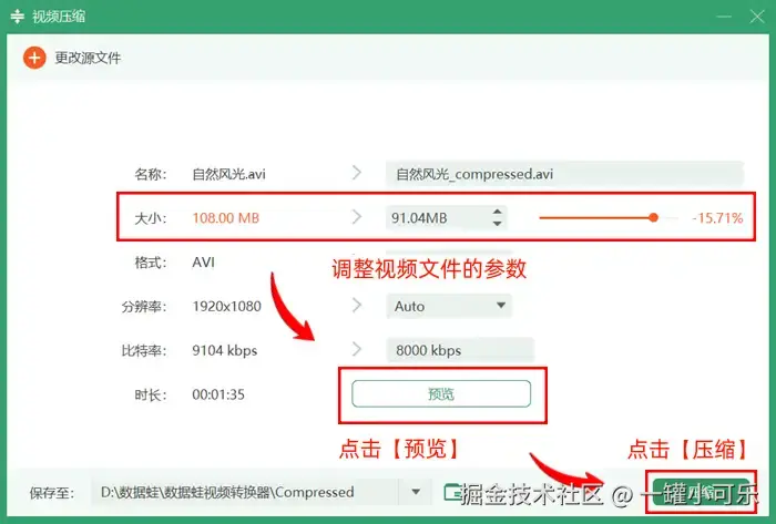 步骤3:在视频压缩界面,调整视频文件的参数,点击【预览】功能,查看压缩后的视频是否符合要求,确定后点击【压缩】即可。