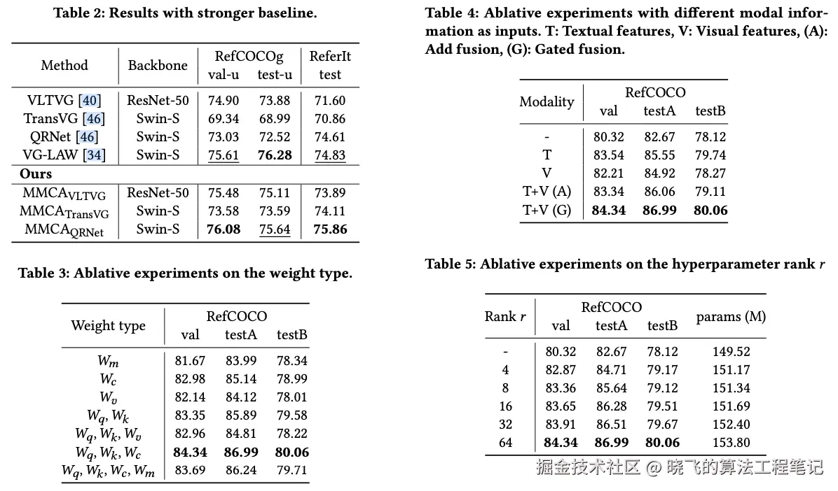 与迁移学习任务不同,这里并不打算微调一小部分参数以适应特定的下游任务,而是希望视觉编码器能够适应各种表达。因此,所有参数矩阵 W0,B,A,Wg,[b1,b2,...,br]T 在训练阶段都是可学习的。