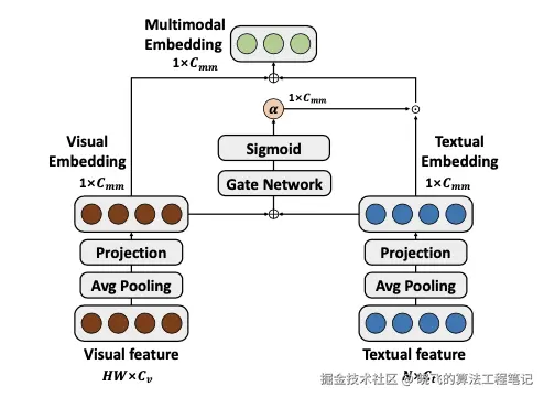 给定文本特征 Ft∈RNt×Ct 和展平的视觉特征 Fv∈RHW×Cv ,使用简单门控机制来融合视觉和文本嵌入: