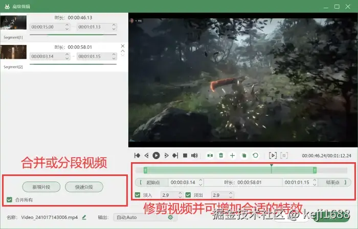 步骤2:录制完成后,我们可以进入 【高级剪辑】 中对游戏视频进行二次创作,合并或分段视频,也可以修剪视频以及给视频增加合适的特效。