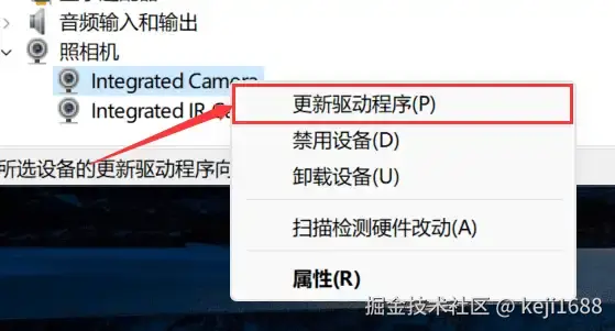 步骤2:更右键点击摄像头设备,选择 【更新驱动程序】 ,然后按照提示操作即可。