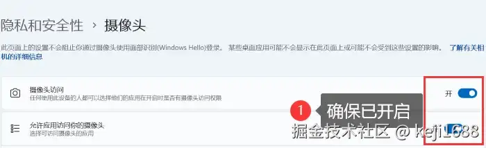步骤2:在 【隐私】 设置中,找到 【摄像头】 选项,并确保已打开 【允许应用访问你的摄像头】 。