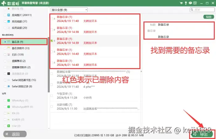 步骤2:在扫描完成页面,找到 【备忘录】 选项,红色的内容就代表已经删除的数据。找到需要的备忘录进行恢复后就可以导出备忘录了。