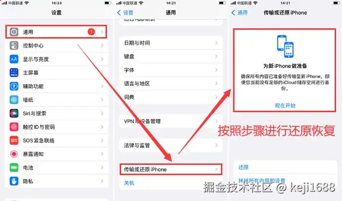 步骤2:确保您的手机连接到稳定的Wi-Fi网络,通过【设置】进入【通用】选项中,选择【传输或还原iPhone】和【抹掉所有内容和设置】后从iCloud备份恢复。需要注意的是,此方法会覆盖当前设备上的所有数据,因此请先做好其他数据的备份。