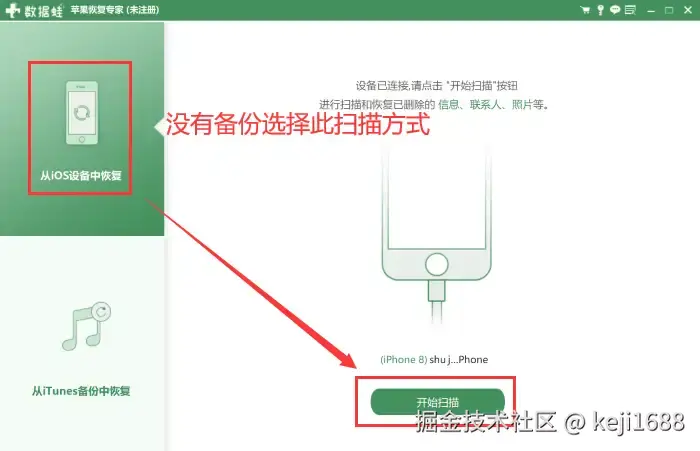 步骤1:连接手机到电脑后,进入苹果恢复专家首页,选择 【从iOS设备中恢复】 的方法进行扫描。