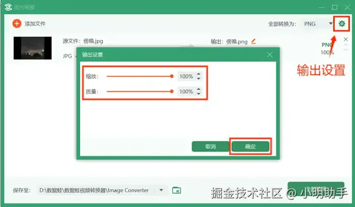 步骤4:也可以点击右上角的绿色齿轮按钮进行缩放比例、质量等输出设置。注意设置好转换后图像文件的保存路径,确认设置后,点击【全部转换】按钮开始将其他格式的图片转换成PNG格式图片。稍等一会儿,图片格式转换就完成啦。