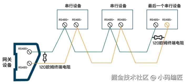 其次,正确的接线方法是手拉手菊花链式接法,如果通信距离较远(比如超过100米),应该在网络的起始端和末尾端各并接一个120Ω的电阻,以减少信号在两端的反射。