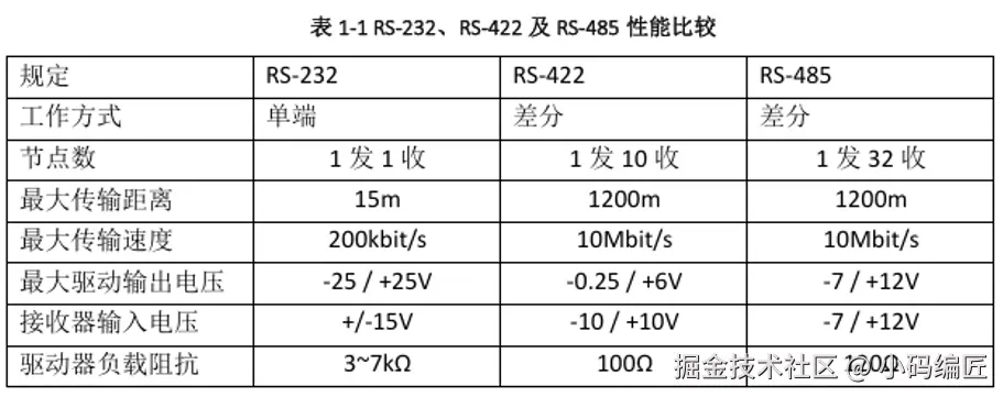 RS是Recommend Standard的缩写,对于串口通信,目前工业领域主要使用RS232和RS485,RS422使用较少。RS485因为抗干扰、传输距离远、支持多节点等优点使用更为广泛,下面是RS232、RS422及RS485的对比图。