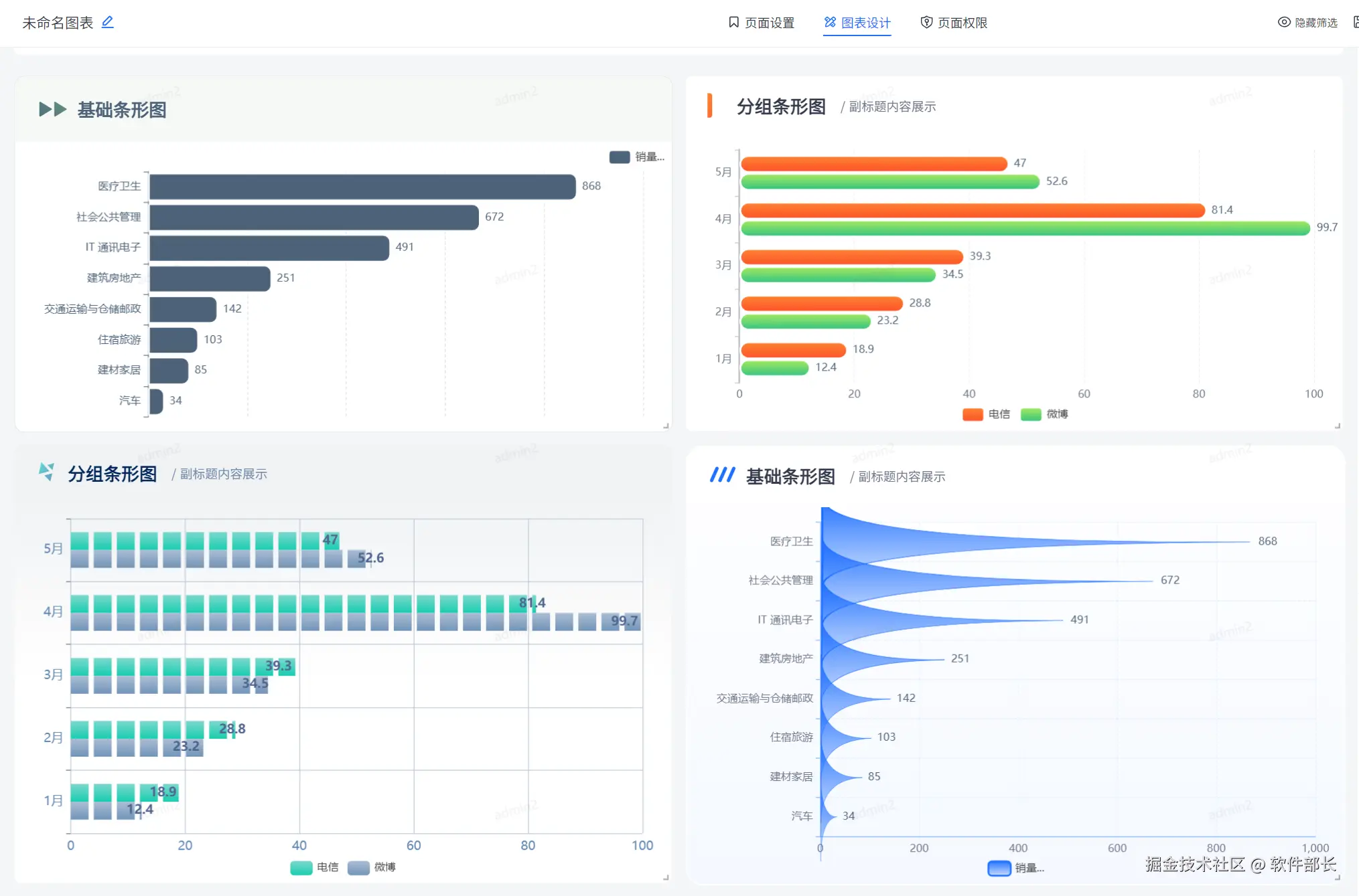 条形图是一种直观且易于理解的数据可视化图表类型,它通过不同长度的条形来表示不同类别的数据大小或数量。每个条形通常代表一个数据类别,而条形的长度(或高度)则对应于该类别的数据值。条形图不仅可以展示单个变量的分布情况,还可以用于比较不同类别之间的差异。