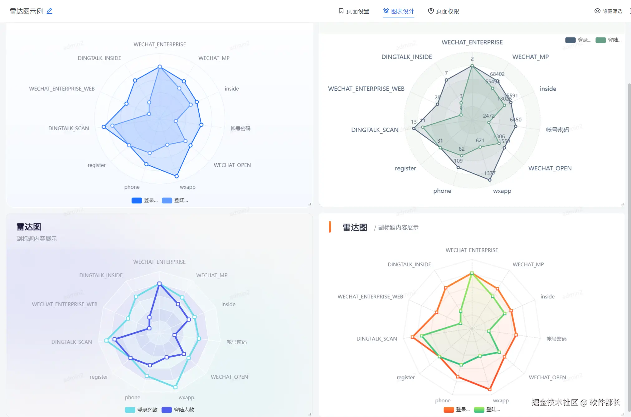 雷达图,又称蜘蛛网图,用于展示多变量数据的一种图形。它通过将每个变量的值绘制在一个闭合的多边形上,可以直观地比较多个对象在多个维度上的表现,如产品特性对比、员工技能评估等。