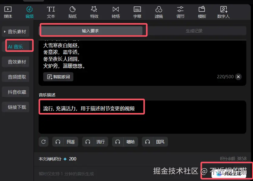 然后让剪映帮我们生成音乐: