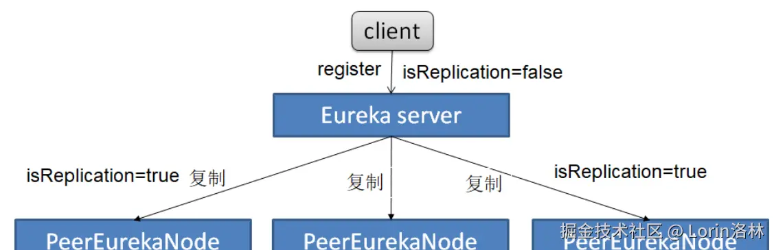 Eureka属于 AP 设计,注册中心是完全平等和独立,且状态并不完全一致,当Eureka Client请求注册、续期、下线到某一个注册中心实例时,该实例会将这些信息同步到集群中其它注册中心,以注册的代码为例: