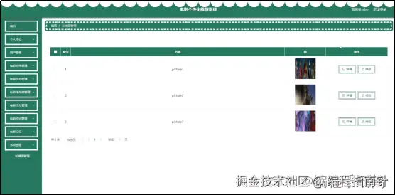 电影分类管理,在电影分类管理页面可以对索引,电影分类等内容进行详情,修改和删除等操作,如图5-9所示。