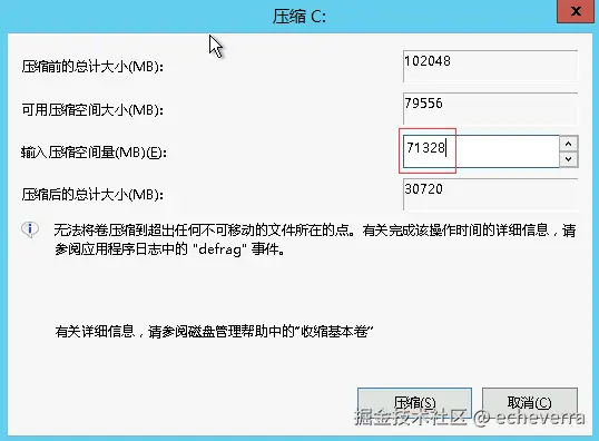 设置要压缩出来的 D 盘空间,最后一项压缩后的大小是 C 盘的大小,建议根据总磁盘大小留 20-30G 的空间,如果不想计算,填写 30000 大概小 30G 的 D 盘容量应该就差不多了。然后一直下一步直到完成。