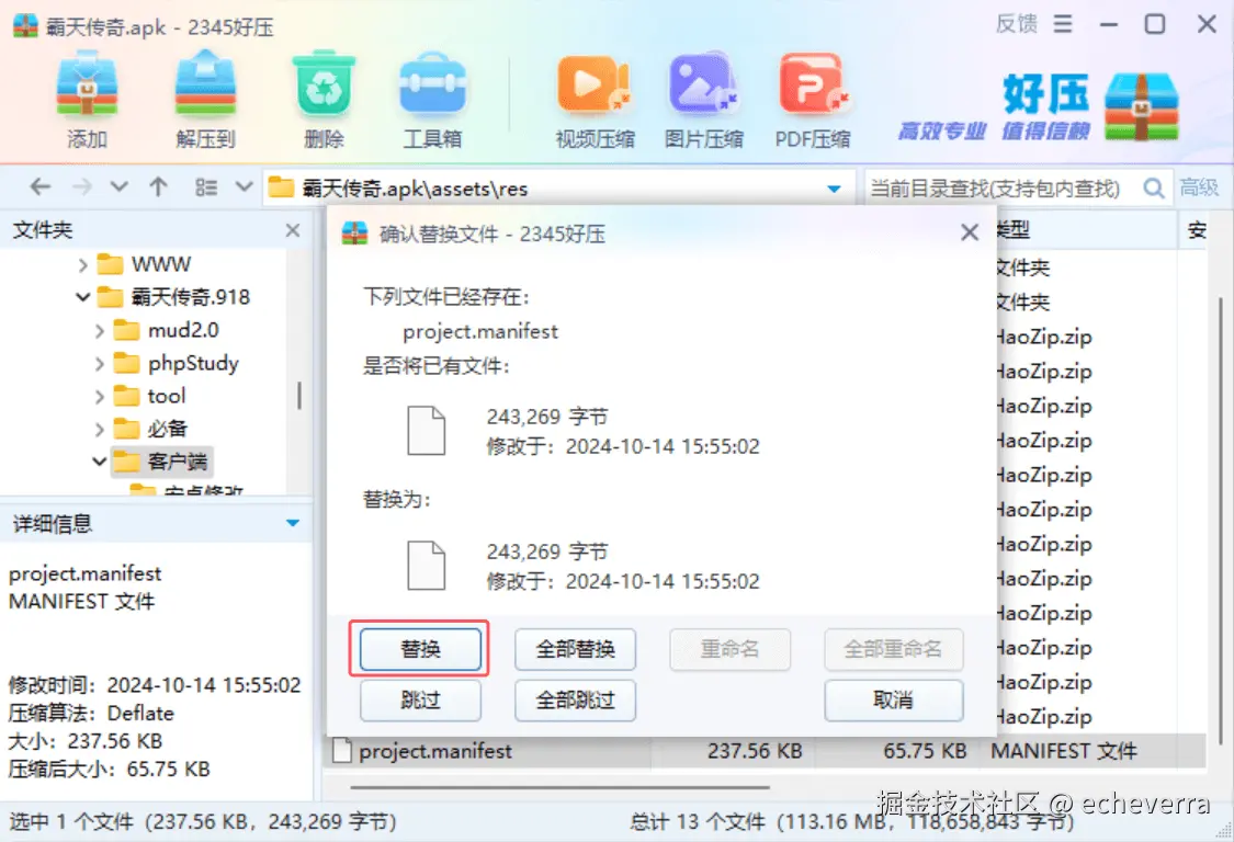 用好压打开霸天传奇.apk,找到project.manifest文件拖出来,用 notepade++ 工具修改就可以,将 IP(43.139.168.207)修改为你的 IP,修改完成后拖回到对应目录下替换。