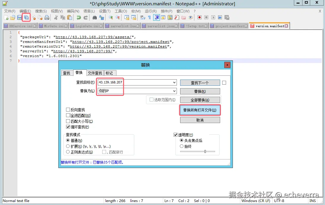 其中1-8个可以全部用 notepade++ 工具打开,通过替换所有打开的文件,全部替换 IP,然后保存。