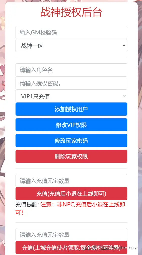 玩家 GM 后台:http://IP:99/gmht/,填写角色名和设置的密码登录,就可以充值和发送物品了。