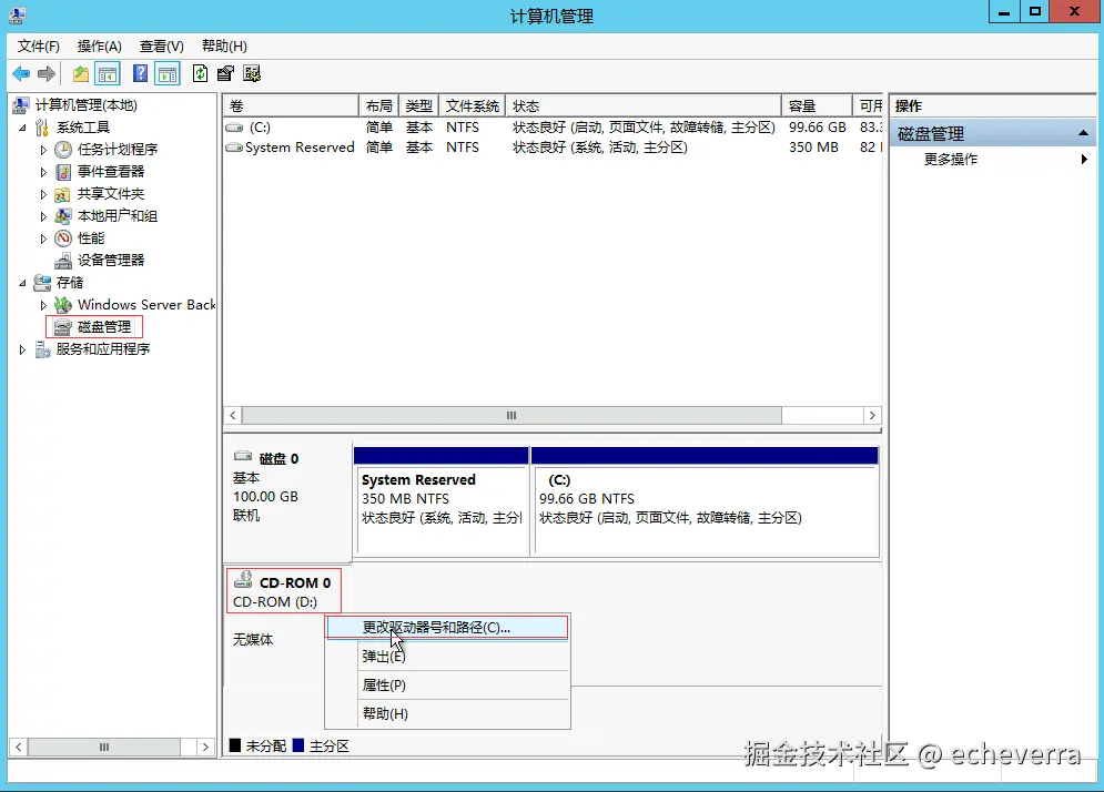 选择左侧磁盘管理,点击 CD-ROM 鼠标右键,选择更改驱动号和路径。