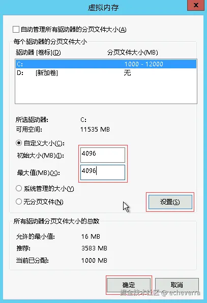 默认选择 C 盘创建虚拟内存,我这里填写 4G 的内存,4*1024 也就是 4096,点击设置后确定。这样虚拟内存就创建好啦,需要重启后才生效。