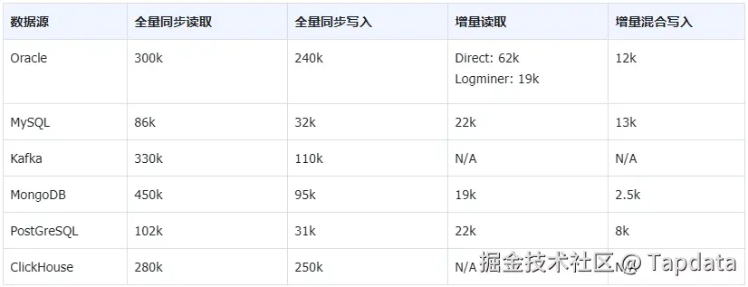 全量同步性能:测试 TapData 在处理大量数据时的吞吐量及效率,例如 Oracle 到 ClickHouse 的全量同步吞吐达到了 250k RPS,而 Kafka 到 ClickHouse 的吞吐表现高达 210k RPS。