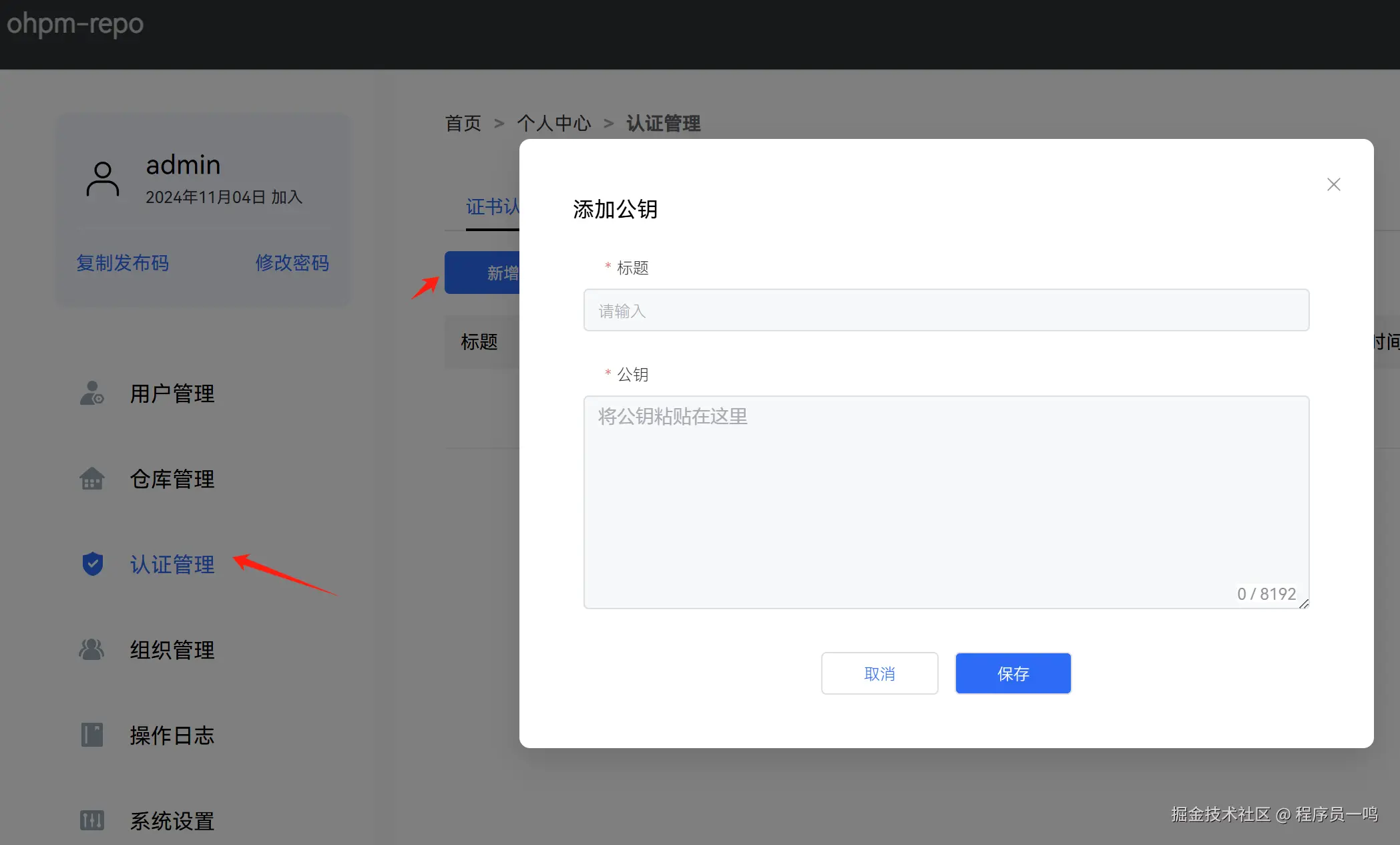 登录 ohpm-repo 私仓管理地址,找到认证管理,把.pub文件里的内容粘贴到这里。