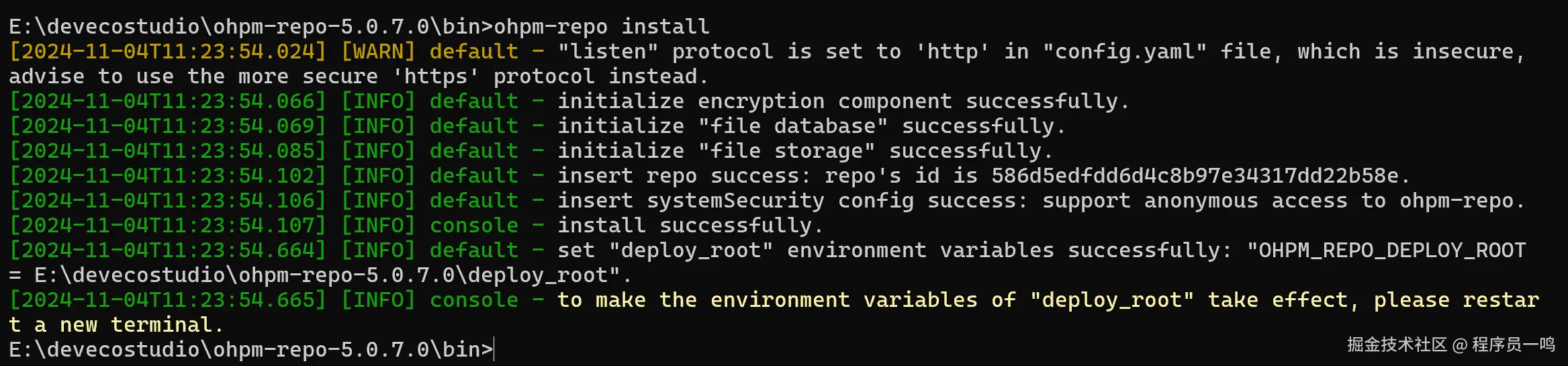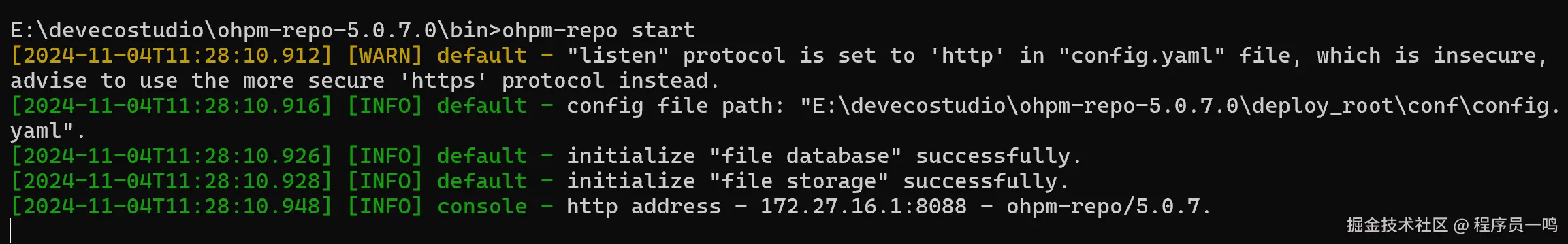 ohpm-repo安装成功后,进入ohpm-repo工具包解压目录下的 bin 目录下,执行如下命令,启动 ohpm-repo: