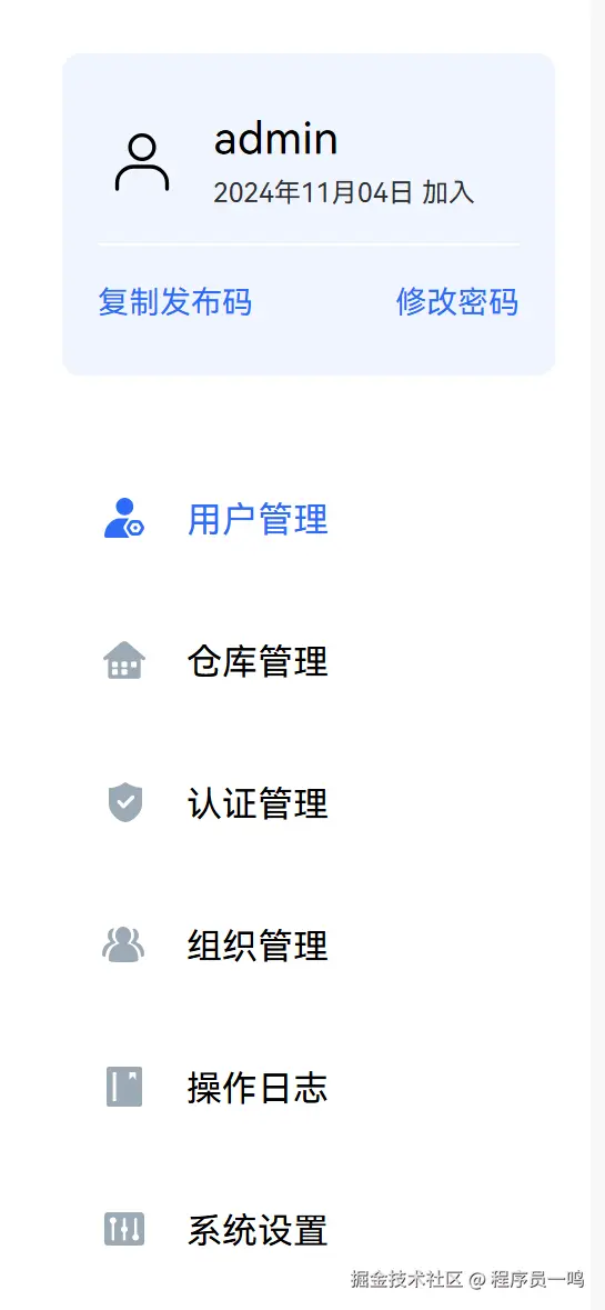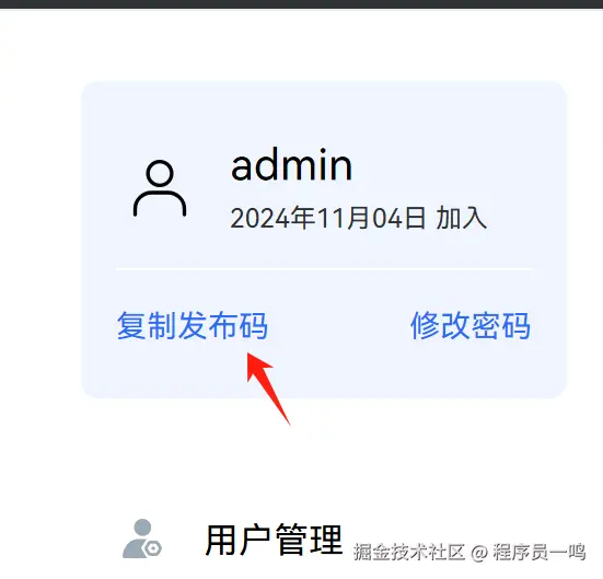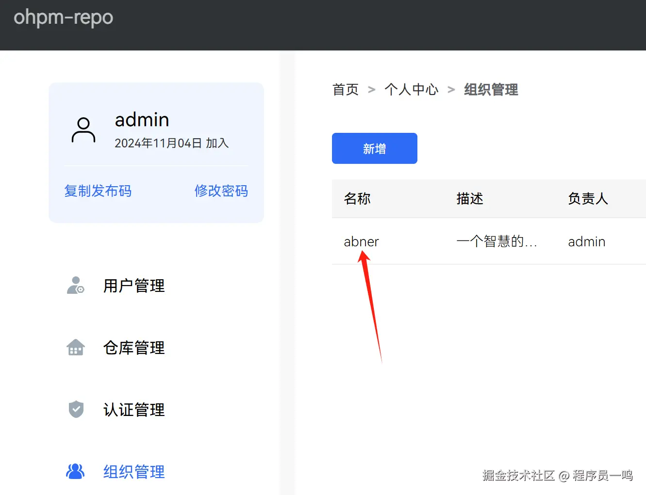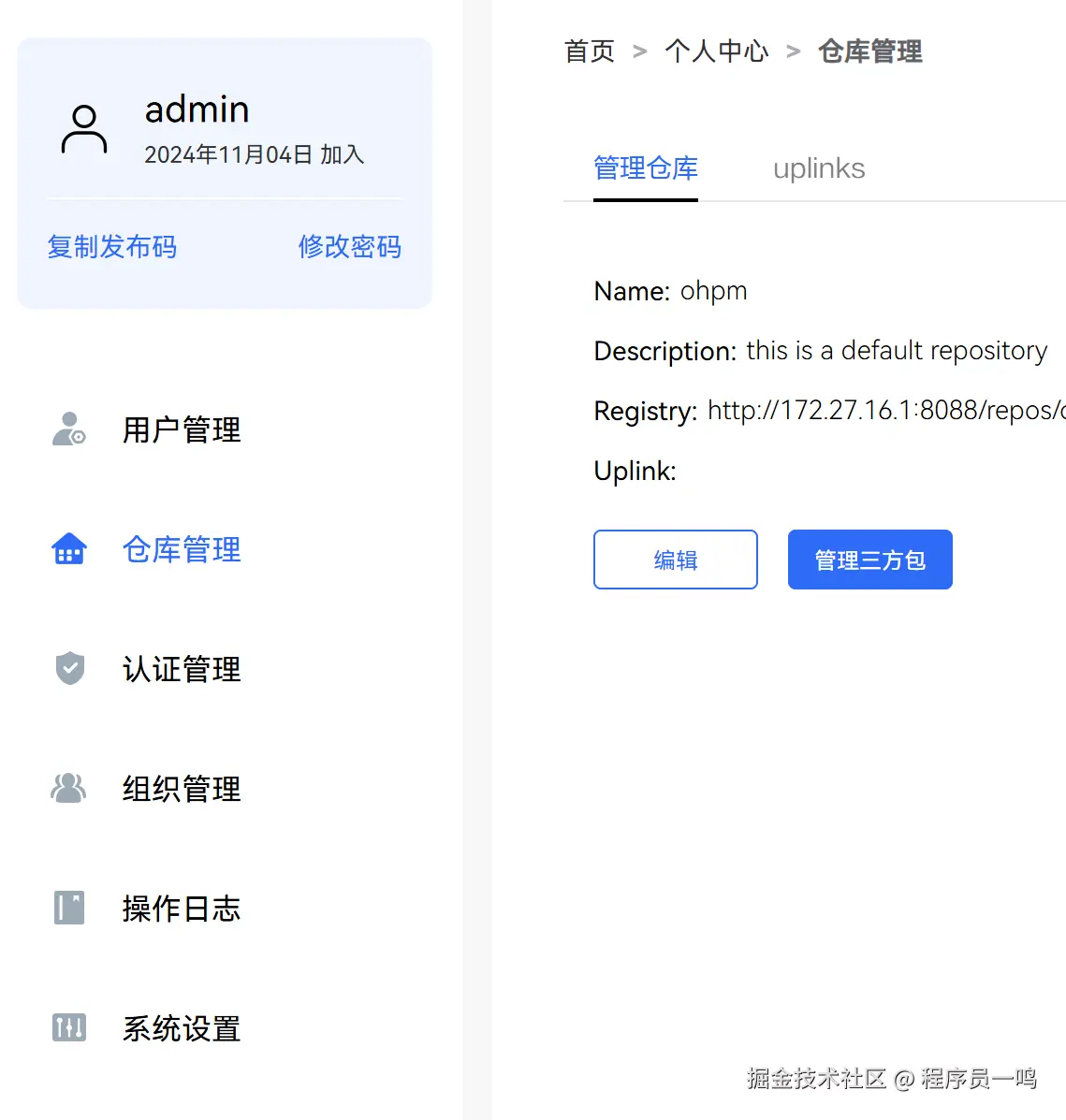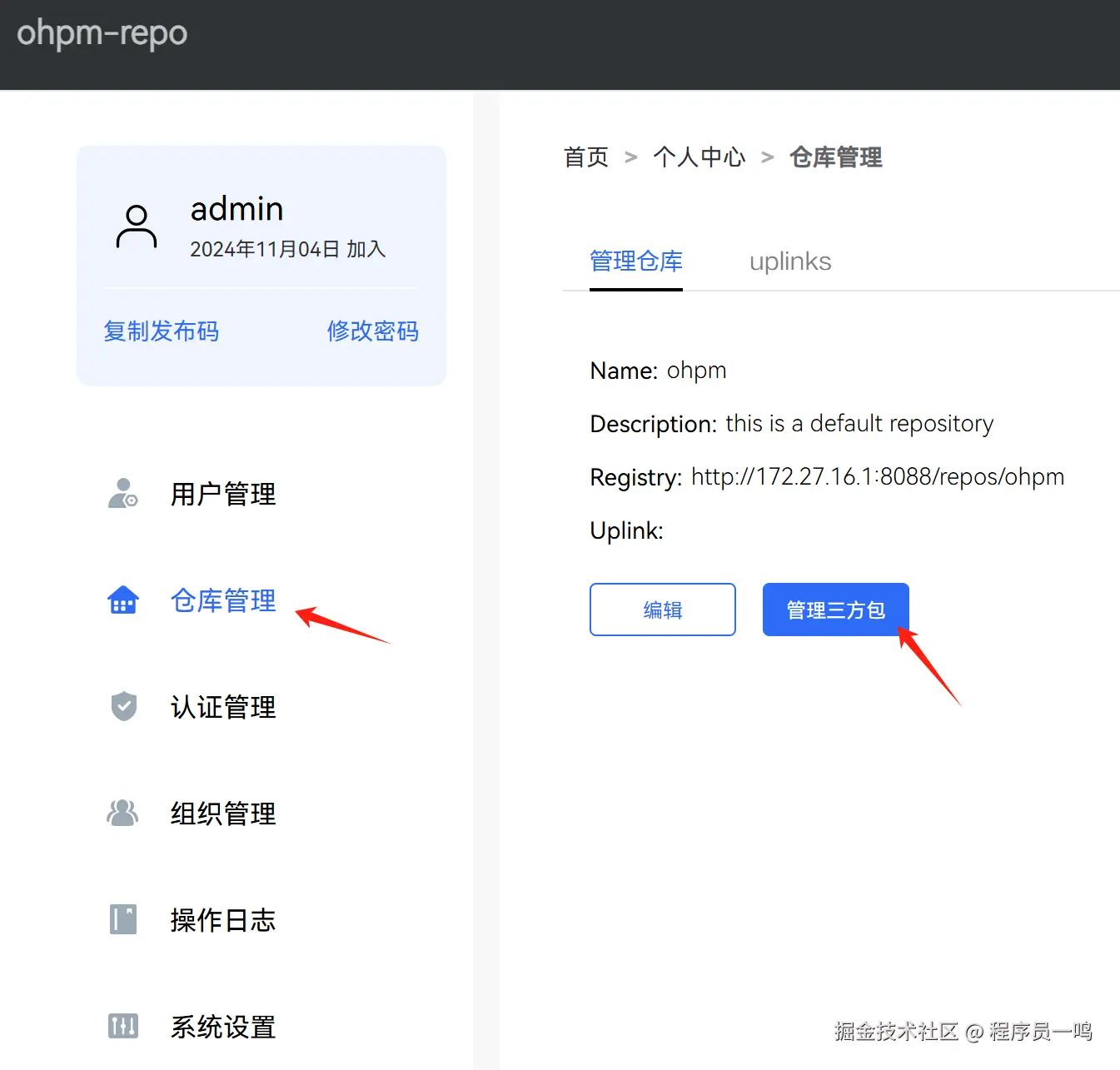 登录 ohpm-repo 私仓管理地址,单击主页右上角的个人中心,复制发布码。