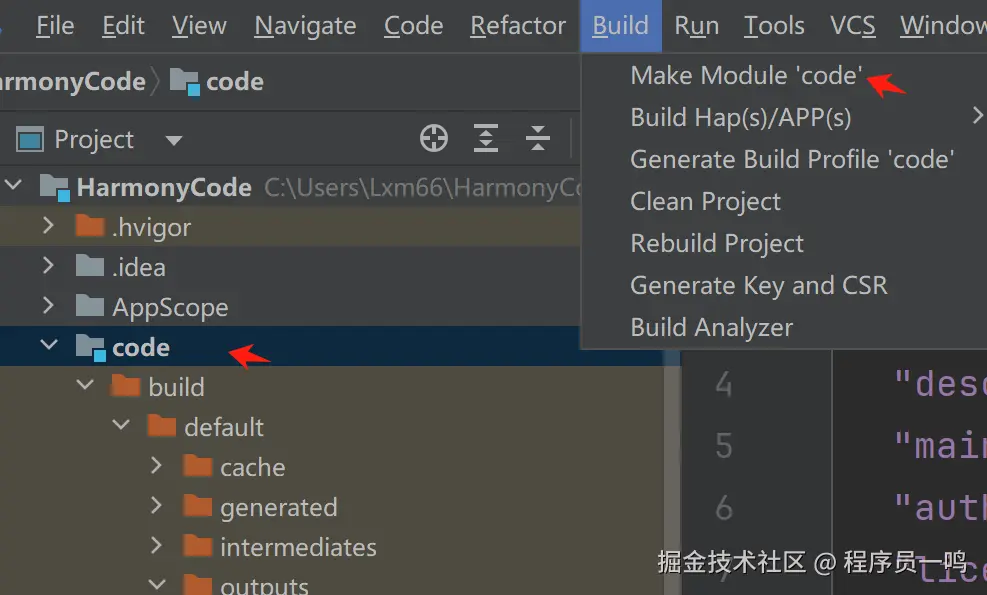 选中动态共享包模块的根目录,点击Build > Make Module ${libraryName} 启动构建。