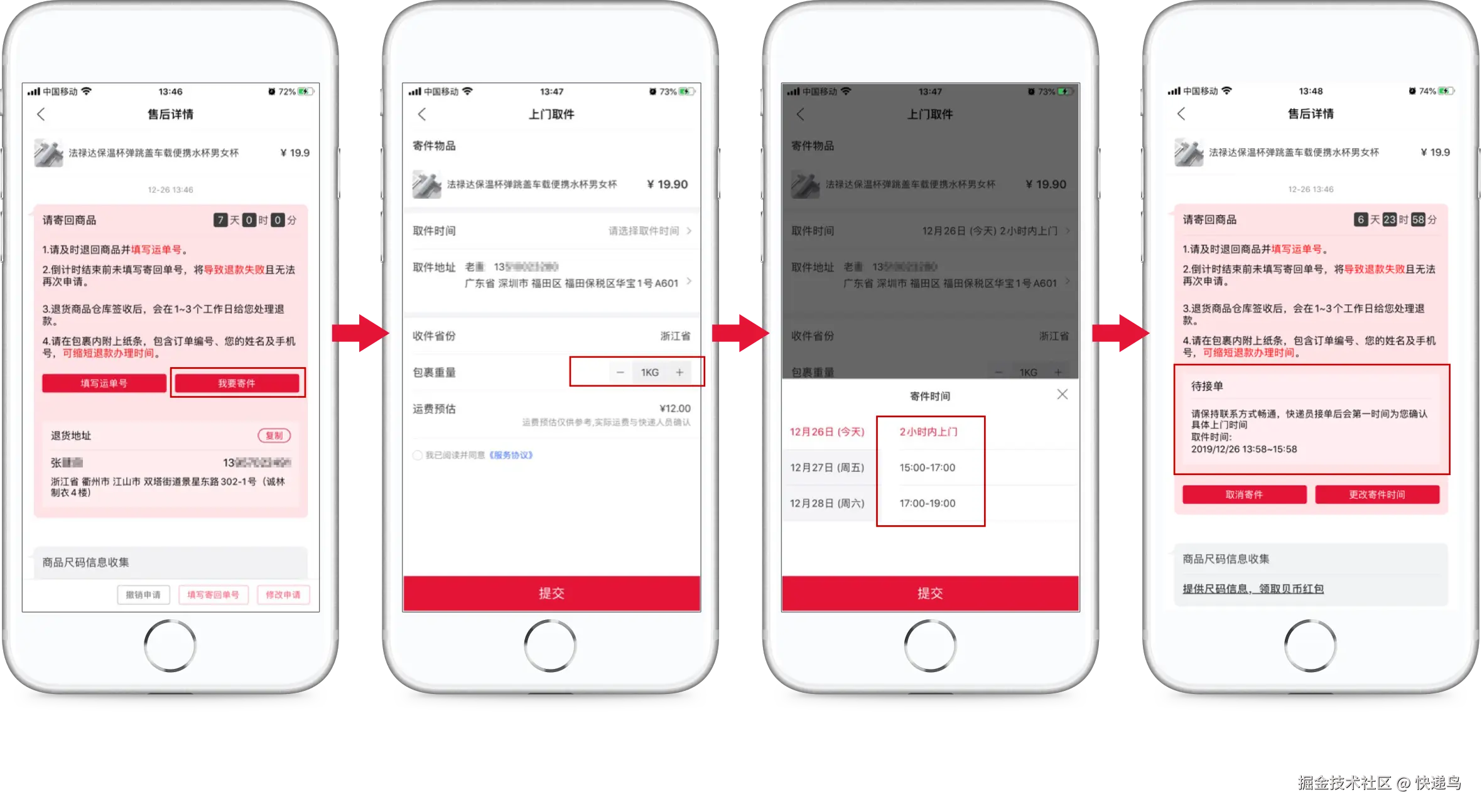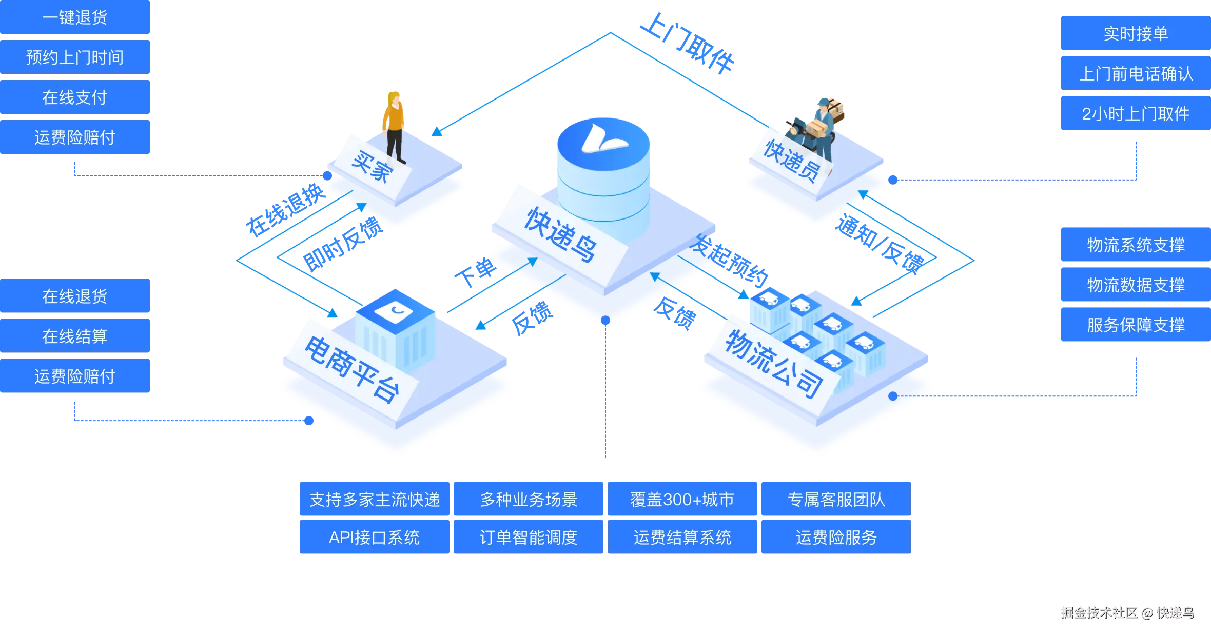 1、移动端 APP、公众号、电商等提供的散客寄件下单模块,通过上门取件直接预约快递员上门揽件,支持在线支付运费;2、电商平台、自营电商售后退货退款时,买家通过平台直接预约快递员上门揽件,支持在线支付运费;