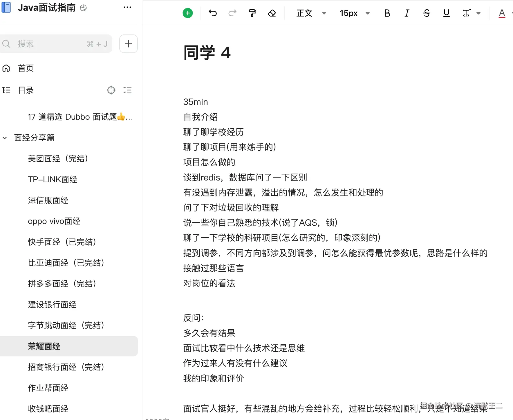 只要面试没有出现大的方向问题,还是能泡出来的,接下来,我们就以《Java 面试指南》中收录的同学 4 面经来看看,荣耀的面试官都喜欢问哪些问题,26 届的小伙伴可以做个参考。