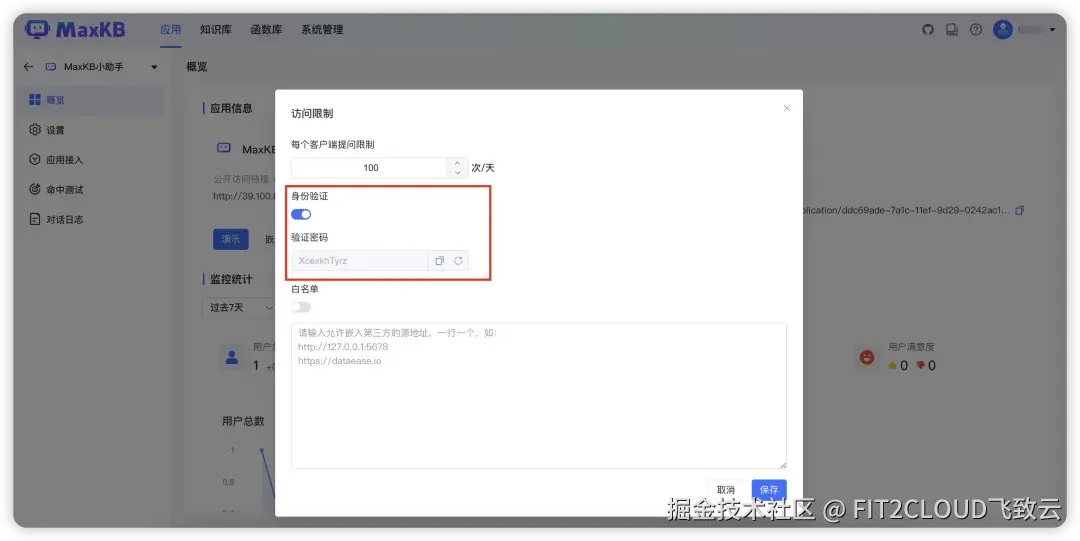 在v1.7专业版中,MaxKB引入了增强的安全措施——身份验证设置。管理员在“概览”→“访问限制”中开启身份验证后,用户需要输入验证密码完成身份确认,才能访问小助手问答界面。这一更新能够有效防止未经授权的访问,切实提升企业知识库数据的安全性。