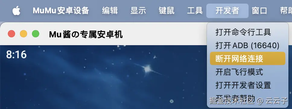 前言:*MuMu模拟器Pro近日上线了一系列开发者功能(需更新至1.5.4以上版本使用),专为提升Mac开发者的生产力而设计。新增功能包括打开命令行工具、打开ADB、断开/恢复网络连接、开启/关闭飞行模式以及打开开发者设置等。此外,MuMu模拟器Pro还提供了一些实用的开发者设置:支持开启Root权限,方便访问或修改系统文件和目录;磁盘共享功能允许修改系统盘,适用于更改系统属性和内置APK等;多种刘海屏样式选择,便于测试应用界面的兼容性;默认启用ADB端口,简化设备连接流程。这些功能和设置为Mac开发者提供了更高效和灵活的开发环境。