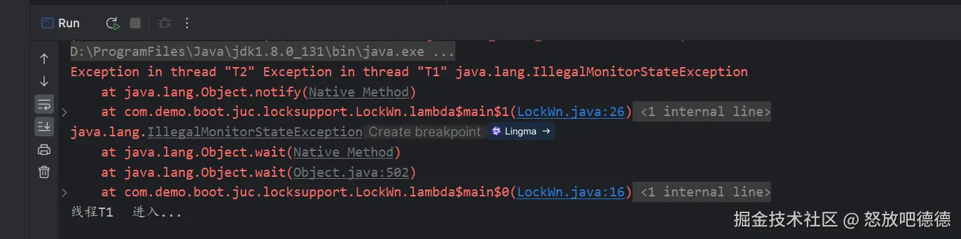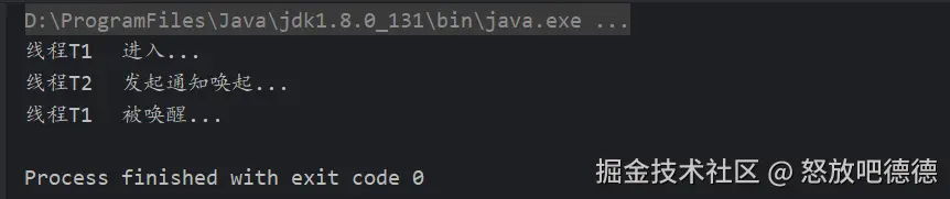 以上代码执行后就能够看到线程T1阻塞之后,线程T2发起通知去释放。