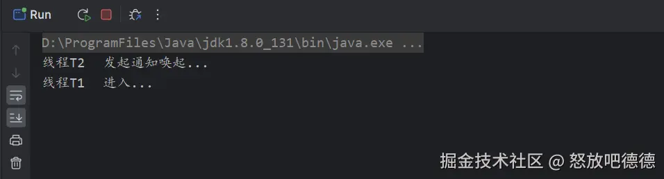 我们通过这个案例,在T1获取锁执行wait之前调用休眠1s,这是为了保证T2线程先执行。也就是限制性了notify,再去执行wait。这时候我们看一下输出结果。