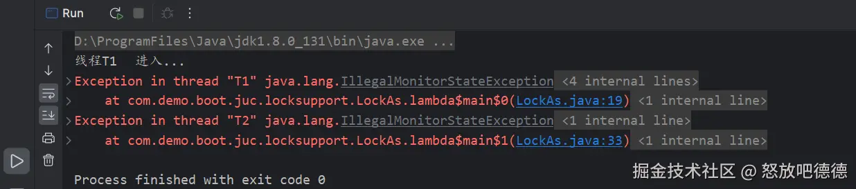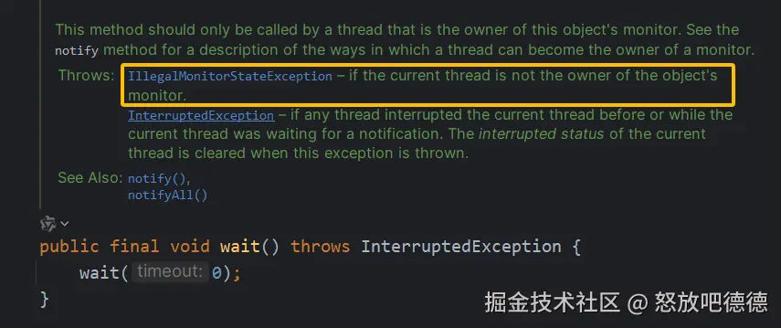 结果是会抛出java.lang.IllegalMonitorStateException异常。这个API文档中,就说过了**只能由拥有此对象监视器的线程调用,如果当前线程不是对象监视器的所有者则会抛出IllegalMonitorStateException**