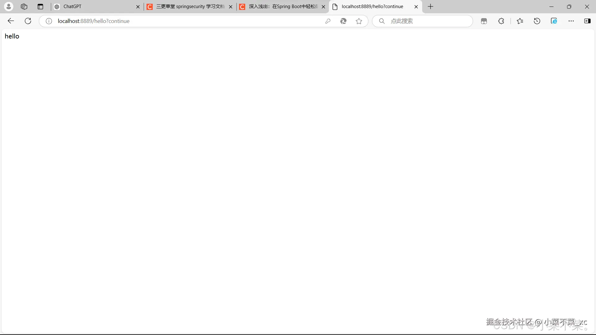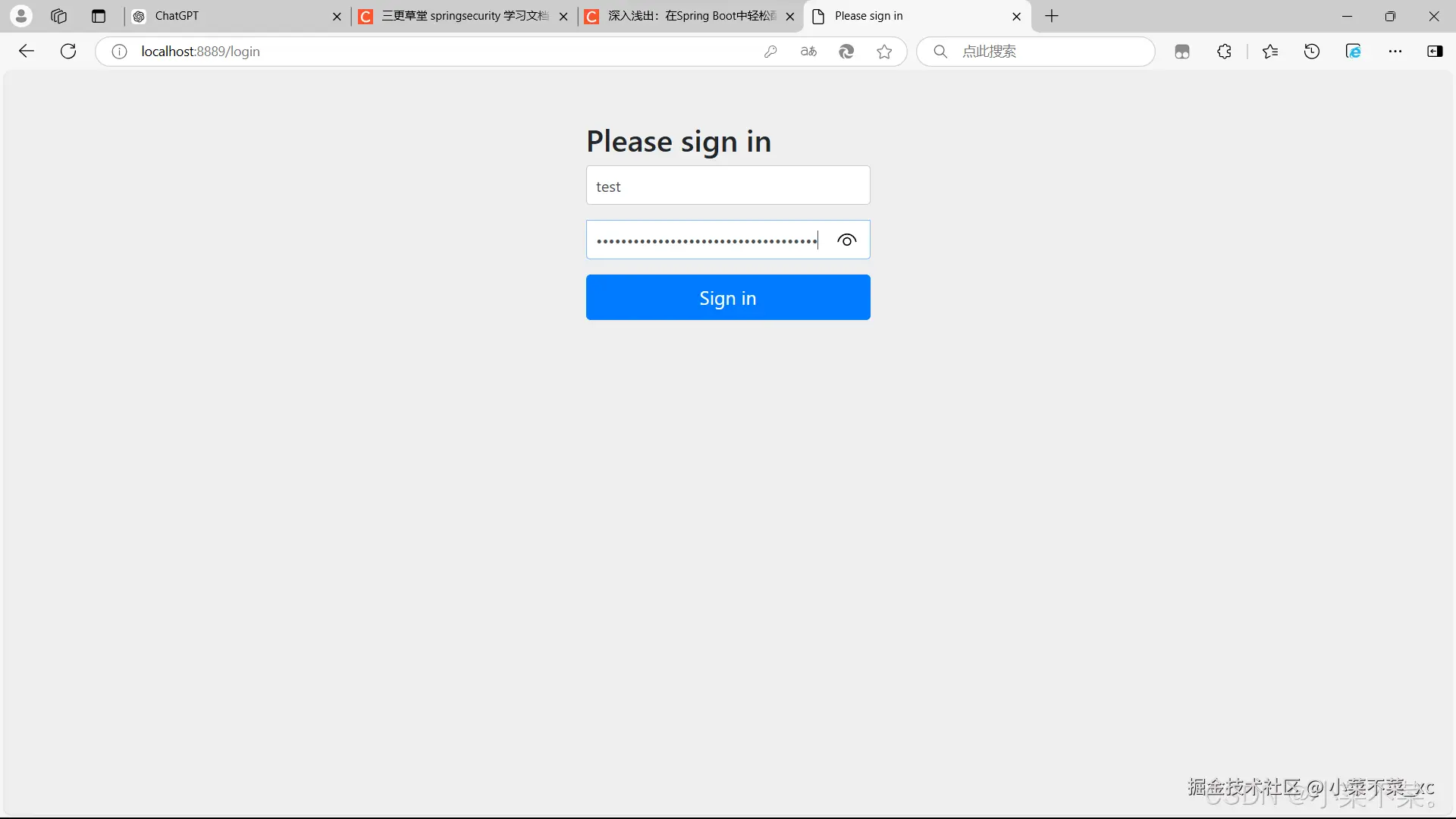登录名写test,密码去IDEA的输出框中查找,接着点击Sign in,界面成功跳转到hello中
