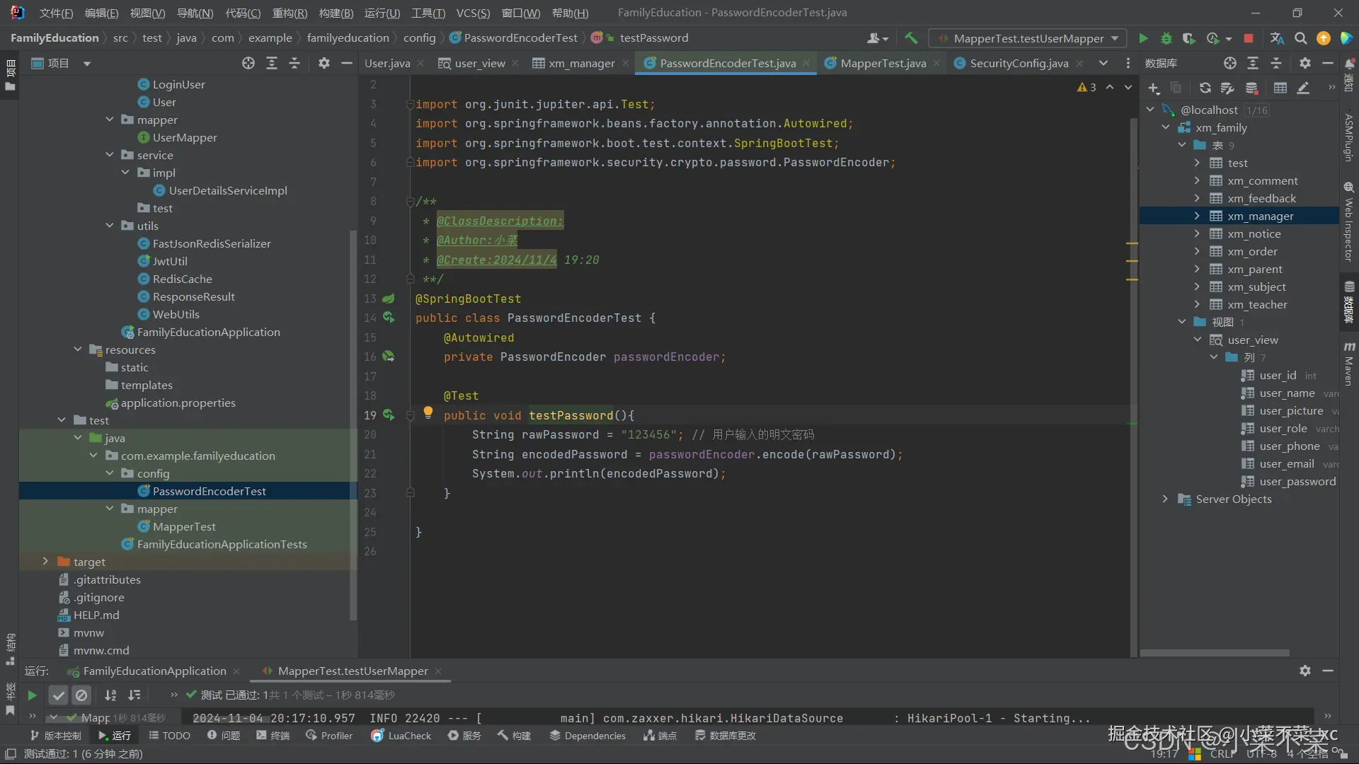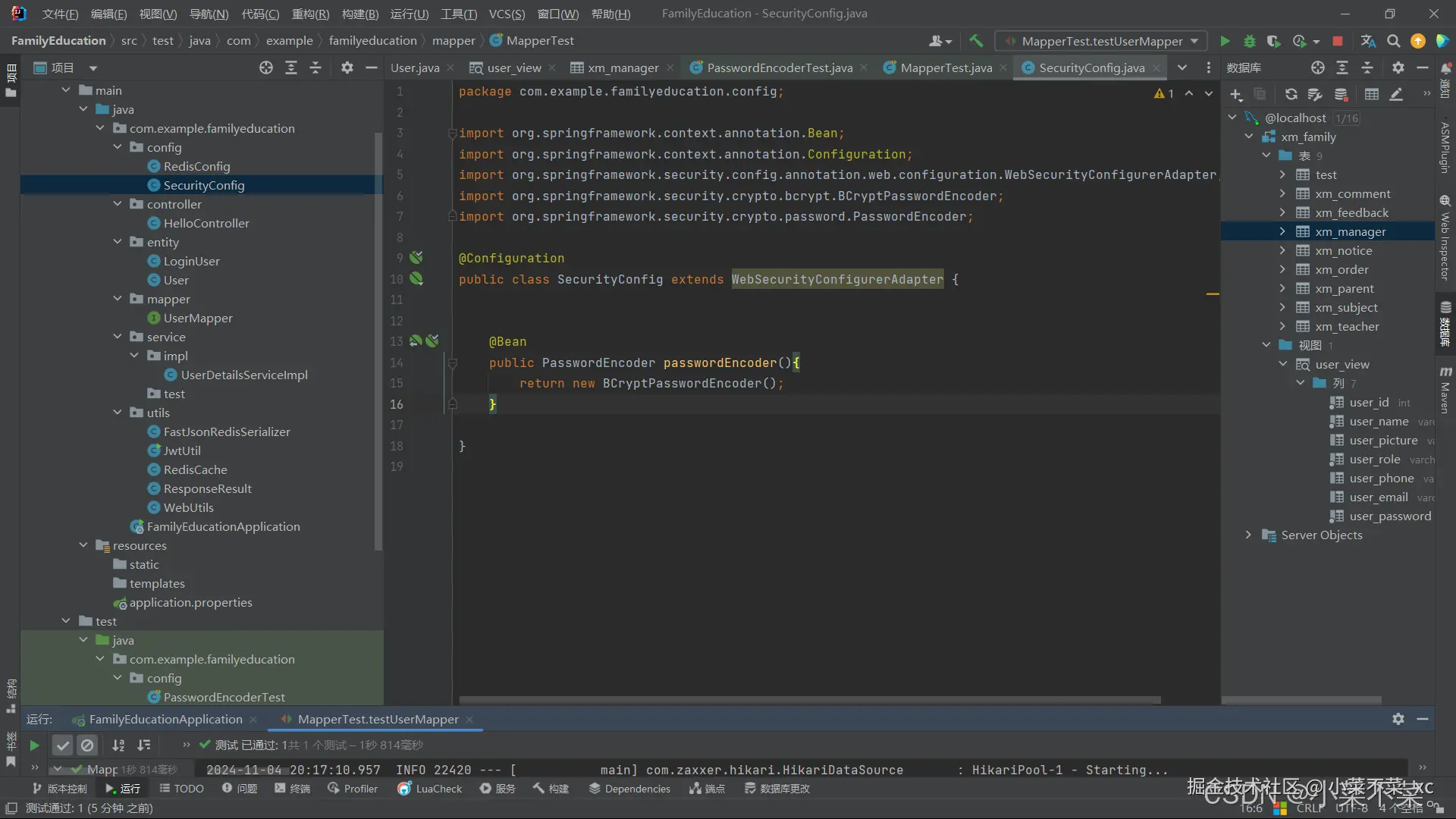 然后我们编写一个测试类输出加密后的密码并添加到数据库中,不然登录的时候会显示密码不是BCryptPassword报错