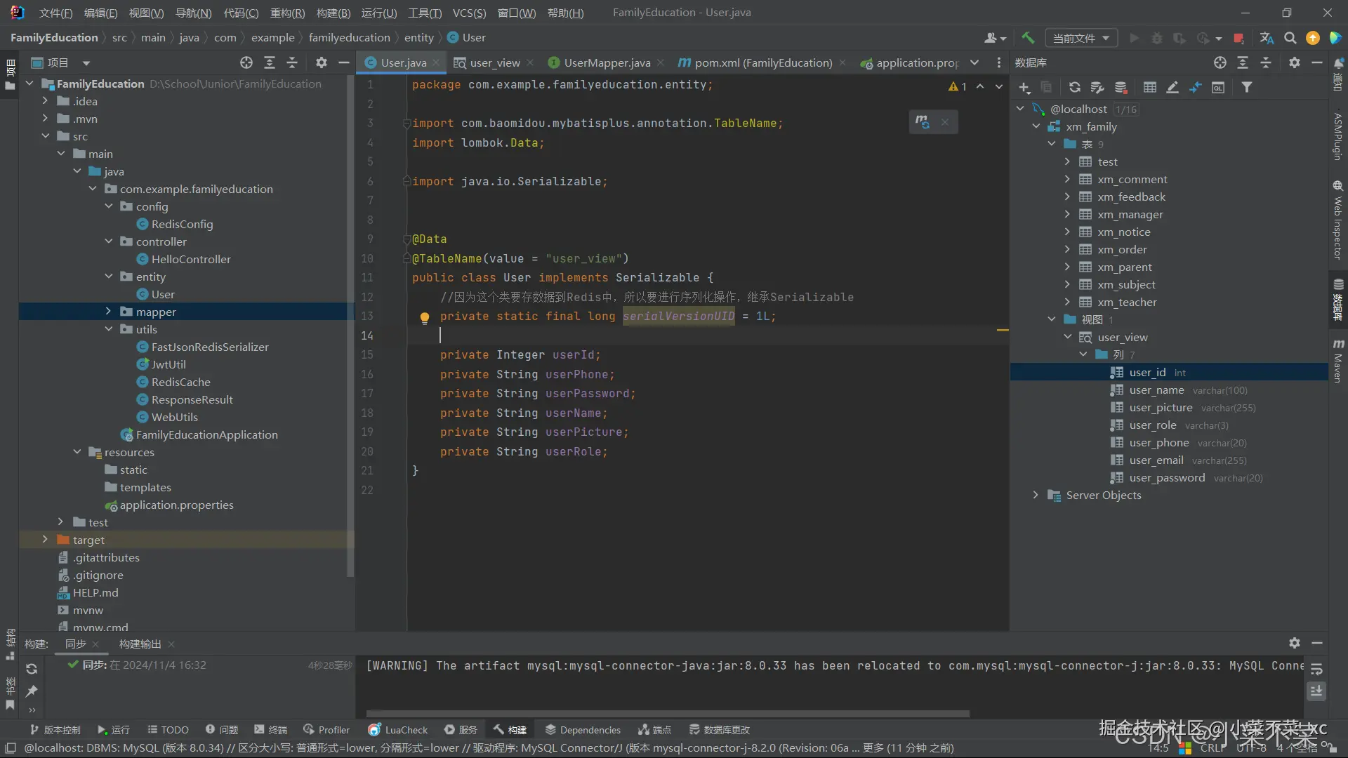 先添加一下实体类和mapper接口信息,我之前的项目中是直接将用户分成了三个表,又使用视图将三个表连接起来,后面出现了很多问题,后续也会进行全部修改,这里先进行演示