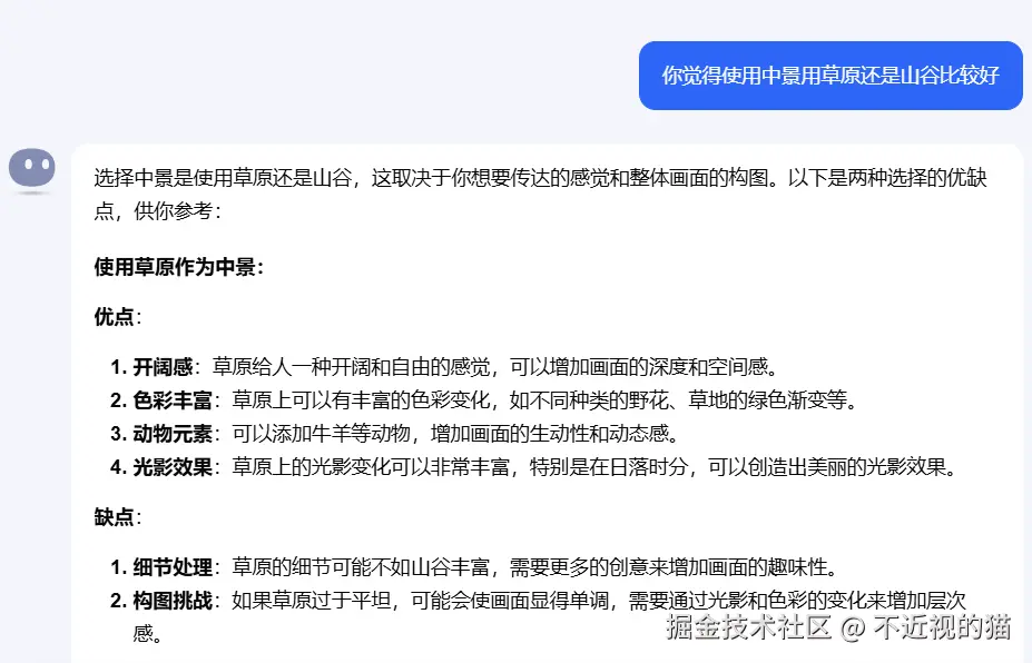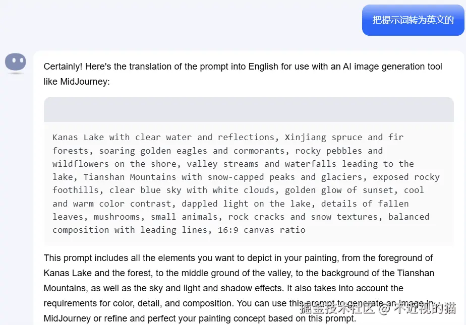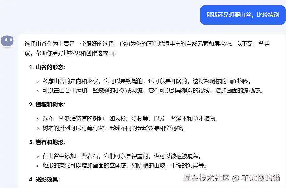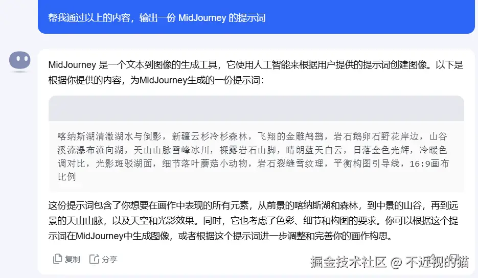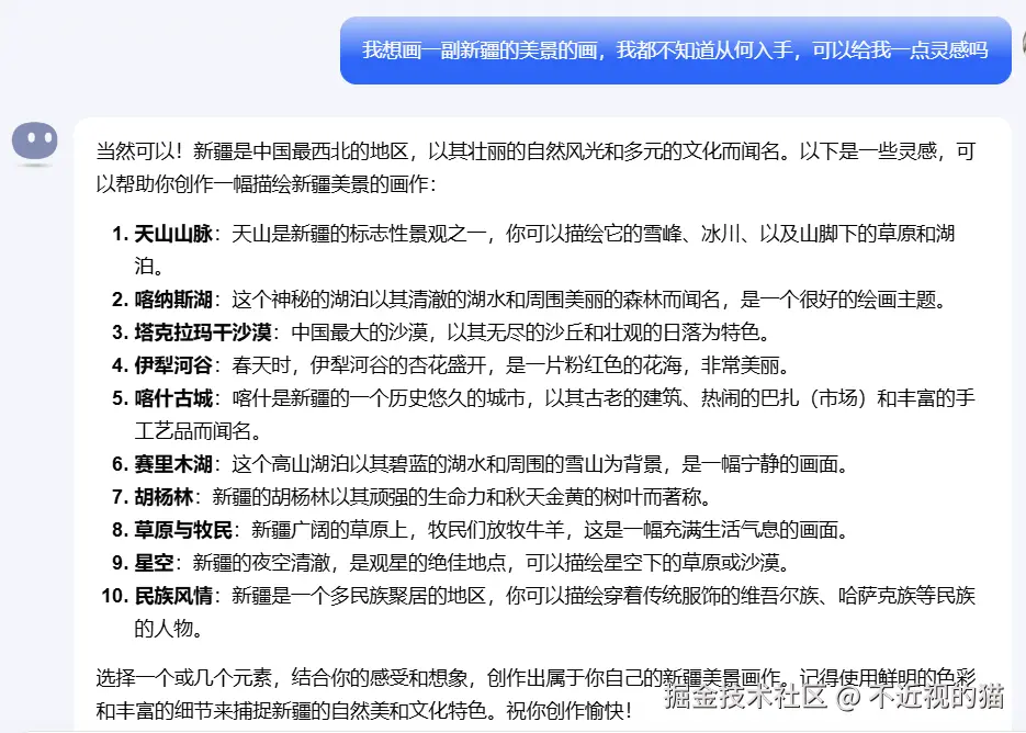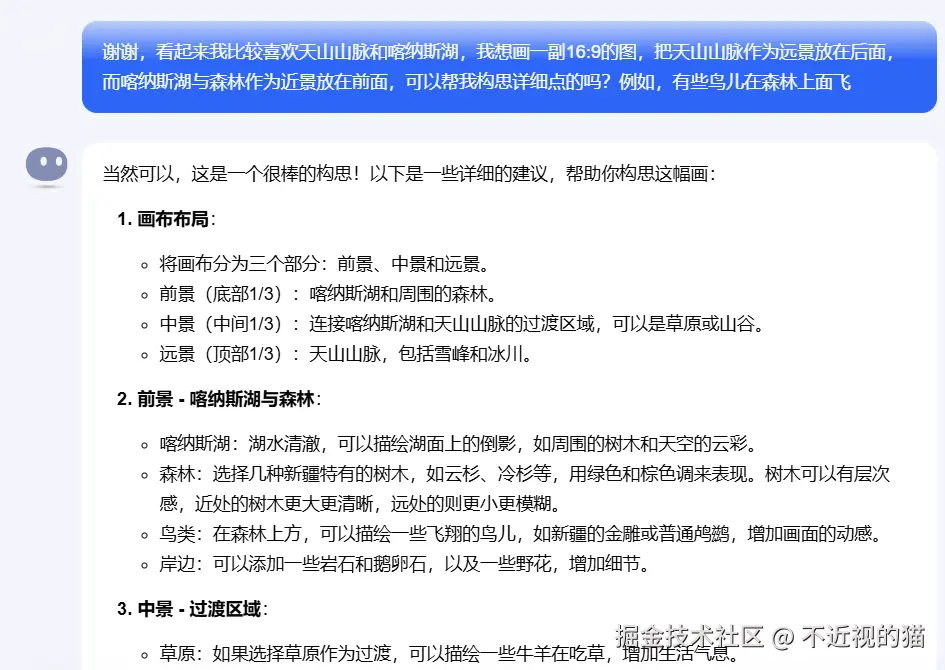 Kimi 回答的内容太多了,我就没有一一截全,但是大概的思路就是这样,有什么不懂问,Kimi 会帮我们一一解答,这样比较才能发挥出 AI 的作用,给其创作空间,而不是一上来就是,给我生成××副新疆美图。