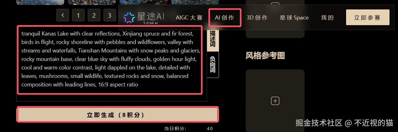 由于主办方预防出现垫图的情况,所以是有指定线上生图的网站的,其中之一就是星途AI:ai.ctgii.com/ 每天都有一些额度,大家可以白嫖看看。