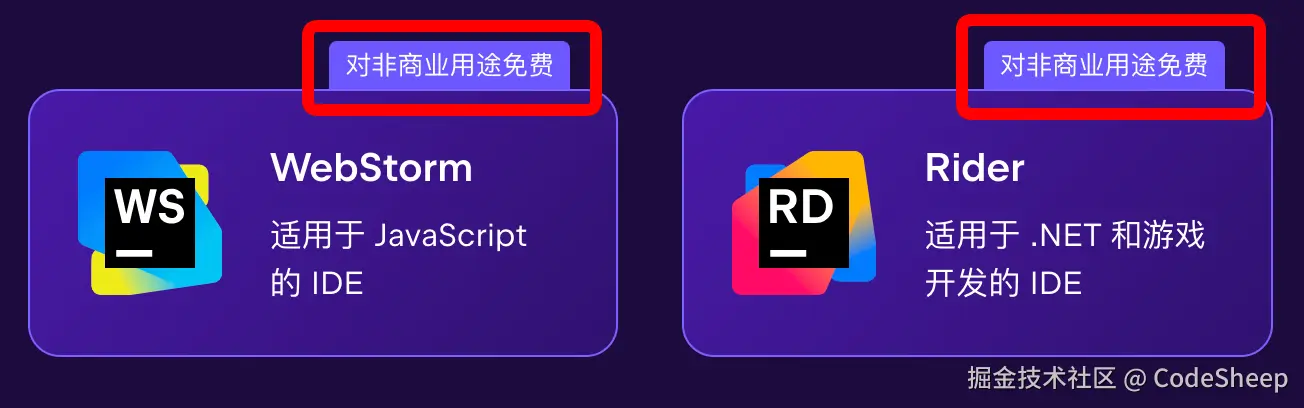 现在去 Jetbrains 的官网来查看这两款软件,可以看到右上角都已经打上了「对非商业用途免费」的标签。