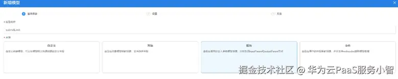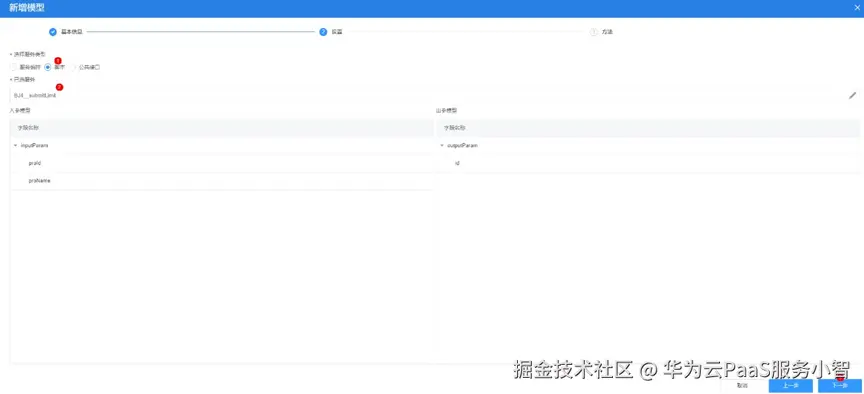 (2)单击“新增模型”,输入模型名称、“来源”选择“服务”,单击“下一步”。