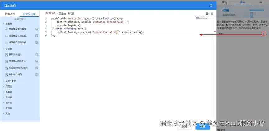 (3)在自定义动作中,输入自定义代码,单击“创建”。