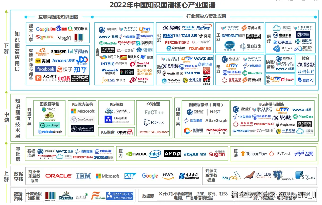 - 中游:知识图谱构建与技术服务,包括知识抽取、表示、建模与平台配置。