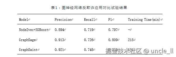 在反欺诈应用中,GraphSaint模型在精确率、召回率和F1分数方面表现最佳,且训练时间较短,显示出其在实际应用中的优势。